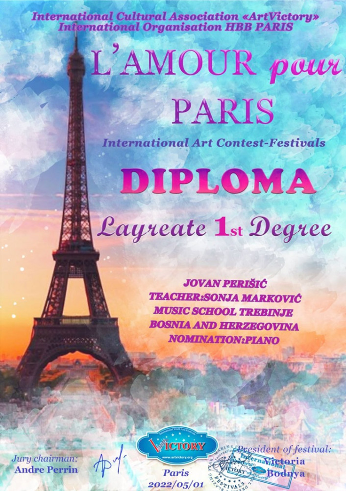 Jovan Perišić, učenik prvog razreda osnovne Muzičke škole Trebinje, u klasi klavir profesorice Sonje Marković osvojio je laureat na Međunarodnom takmičenju u Parizu, saopšteno je iz Muzičke škole.
