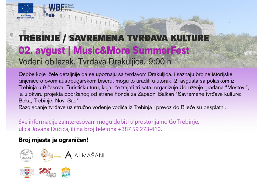 Osobe koje žele detaljnije da se upoznaju sa tvrđavom Drakuljica, i saznaju brojne istorijske činjenice o ovom austrougarskom biseru, mogu to uraditi u utorak, 2. avgusta sa polaskom iz Trebinja u 9 časova.