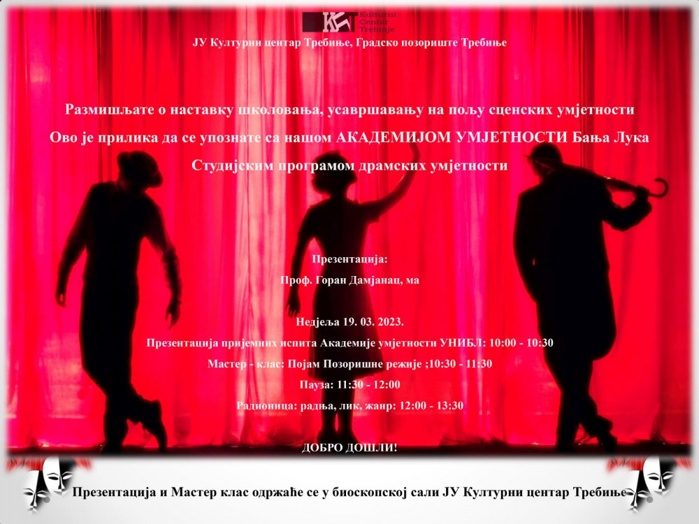 JU "Kulturni centar", Gradsko pozorište Trebinje organizuju, u saradnji sa Akademijom umjetnosti Banja Luka, za sve zainteresovane prezentaciju prijemnih ispita Akademije i master klas pozorišne režije. Prezentaciju i master klas će voditi prof. Goran Damjanac, ma.