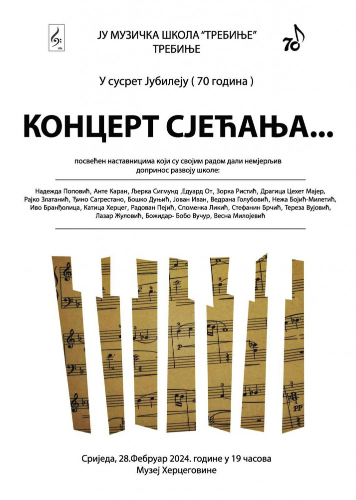 U Muzeju Hercegovine Trebinje veceras će biti održan koncert sjećanja posvećen nastavnicima koji su svojim radom dali nemjerljiv doprinos razvoju i radu Muzičke škole Trebinje od njenog osnivanja do danas.