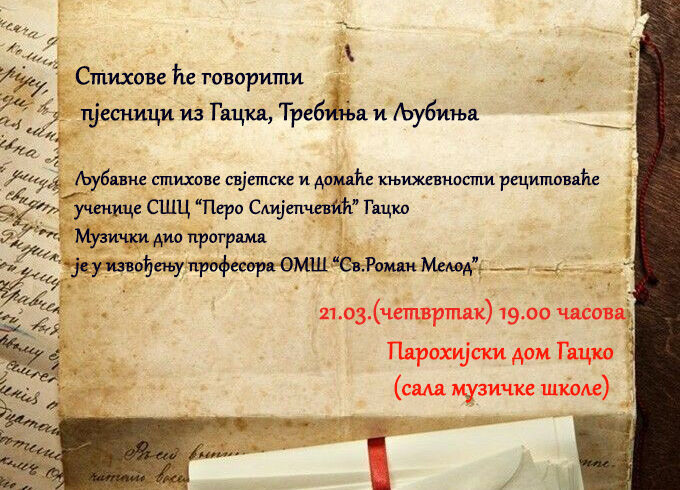 U četvrtak 21.03. u 19.00 časova  u Parohijskom domu biće održano tradicionalno  Veče poezije pjesnika iz Gacka i njihovih kolega iz okruženja,pod nazivom „U susret proljeću“. Osim pjesnika koji će govoriti svoje pjesme, bisere svjetske i domaćepoezije će recitovati talentovane učenice SŠC „Pero Slijepčević“ Gacko Katarina Govedarica i Jelena Tepavčević.