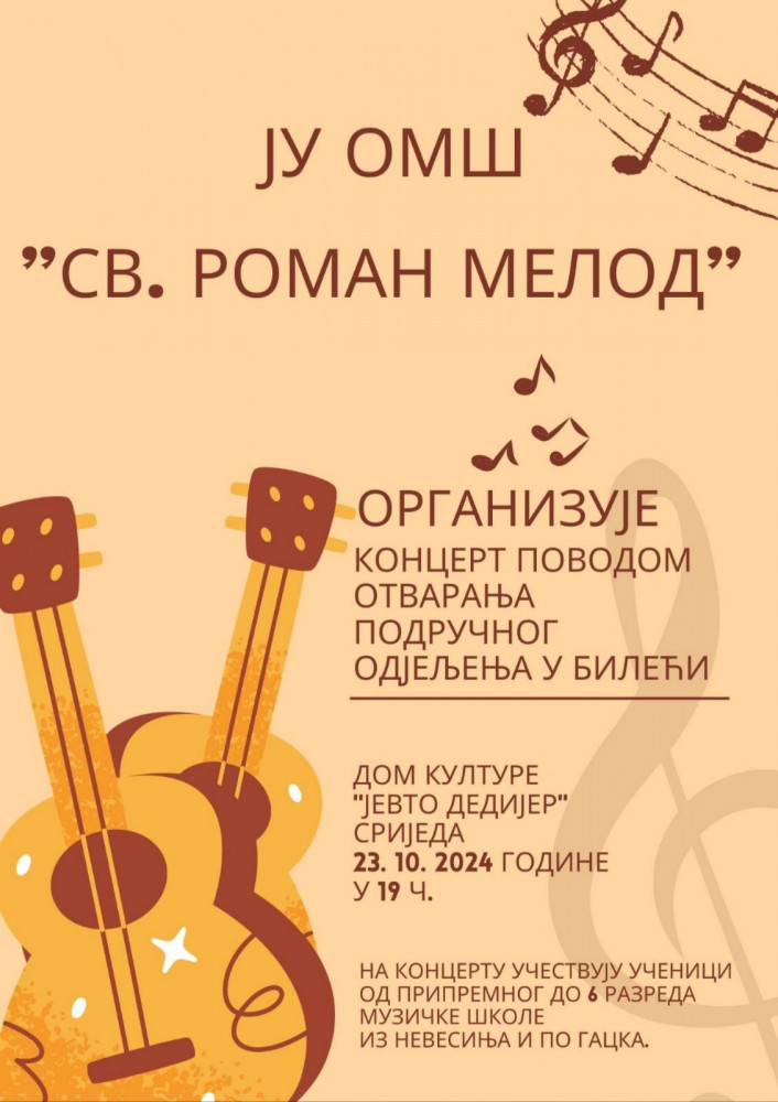 Povodom početka rada muzičke škole u Bileći učenici Osnovne muzičke škole "Sveti Roman Melod" iz Nevesinja i učenici Područnog odjeljenja iz Gacka održaće svečani koncert u Domu kulture "Jevto Dedijer", u srijedu, 23. oktobra, u 19 časova.