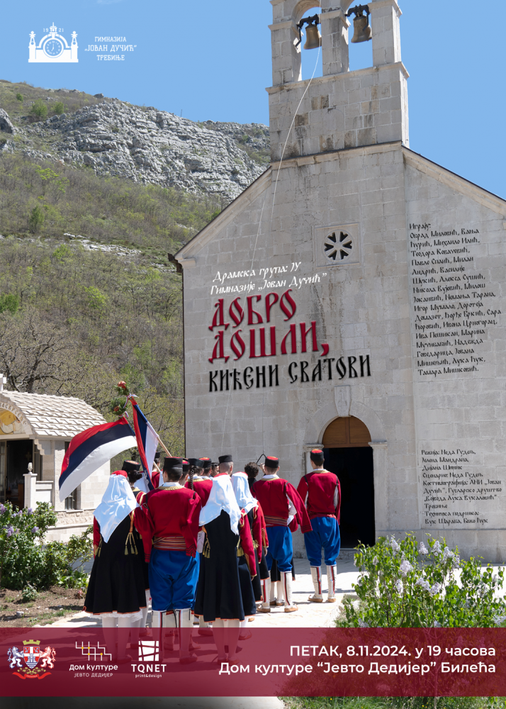 Dramska grupa Gimnazije "Jovan Dučić" iz Trebinja, u petak, 8. novembra, u 19 časova, u Domu kulture “Jevto Dedijer” Bileća će izvesti pozorišni komad "Dobro došli, kićeni svatovi".