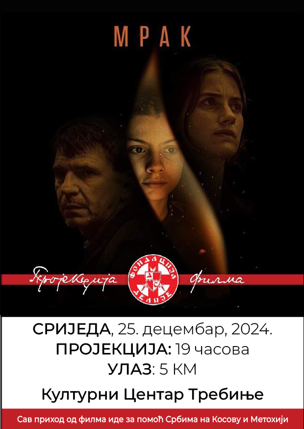 U sklopu Božićne akcije „Fondacije Delije“ u srijedu 25. decembra od 19:00č u Kulturnom Centru Trebinje održaće se humanitarna projekcija filma „Mrak“ . Mrak je srpski psihološki triler u režiji i po scenariju Dušana Milića. Film prikazuje srpsku porodicu sa Kosova i Metohije i njihovu borbu za opstanak nakon martovskog pogroma 2004 godine. Zasnovan je na istinitom događaju, film govori o hrabroj Milici, koja živi u opkoljenoj enklavi na Kosovu i Metohiji. Nestanak njenog oca i ujaka teško utiču na nju i njenu porodicu. Dok njena majka i deda pokušavaju da shvate šta ih snalazi, kroz njene oči vidjećemo jedno djetinstvo suočavano sa surovom stvarnošću života bez struje, u siromaštvu i stalnom strahu.