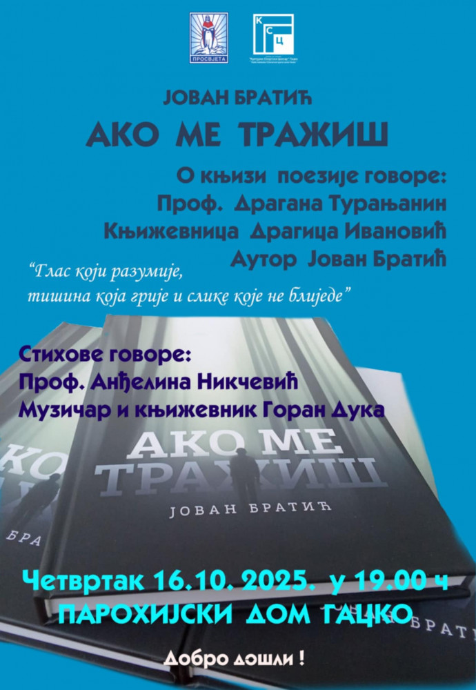 U organizaciji Javne ustanove „Kulturno-sportski centar“ Gacko i SPKD „Prosvjeta“ Gacko, u četvrtak, 16. oktobra 2025. godine, sa početkom u 19 časova, u Parohijskom domu u Gacku, biće održana promocija zbirke poezije „Ako me tražiš“ autora Jovana Bratića iz Nevesinja.