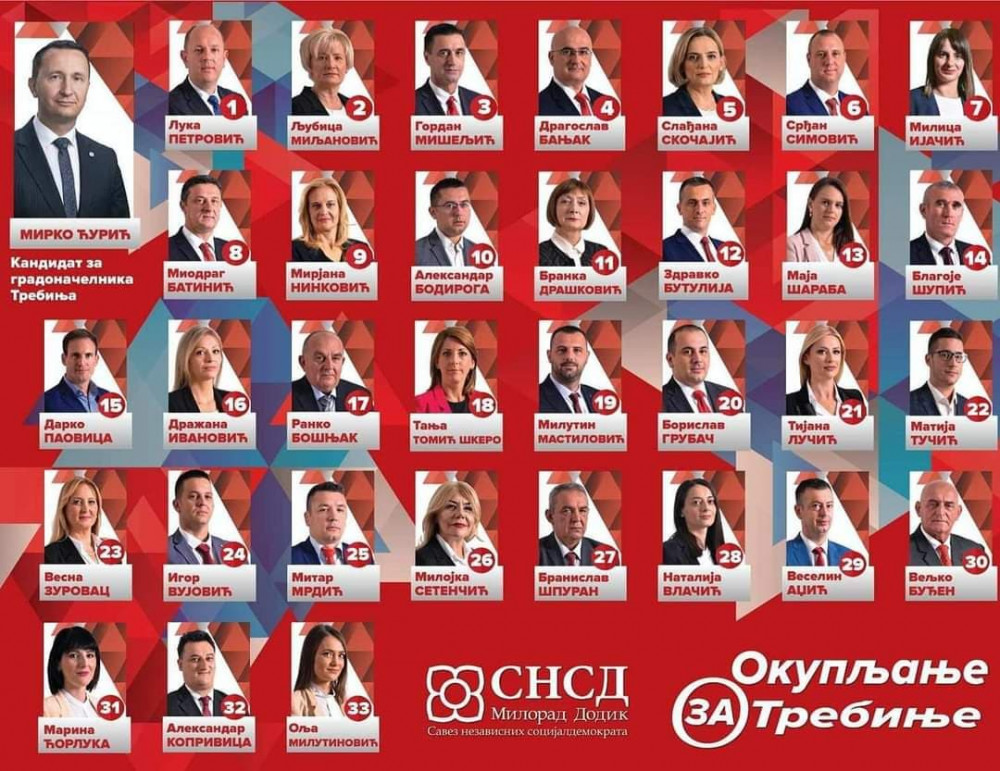 Lista kandidata za gradsku Skupštinu grada Trebinja i kandidat za gradonačelnika gospodin Mirko Ćurić.