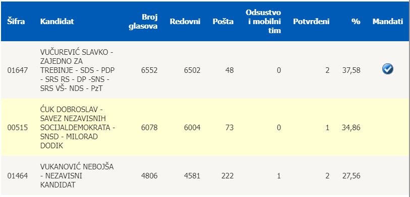 Prema potvrđenim rezultatima Centralne izborne komisije BiH (CIK BiH) objavljenim 6.11.2012. godine, od ukupno 17.436 važećih glasova, Slavko Vučurević osvojio je 6.552 glasa, Dobroslav Ćuk 6.078 glasova, dok je Nebojša Vukanović završio kao posljednji kandidat, s ukupno 4.806 osvojenih glasova.