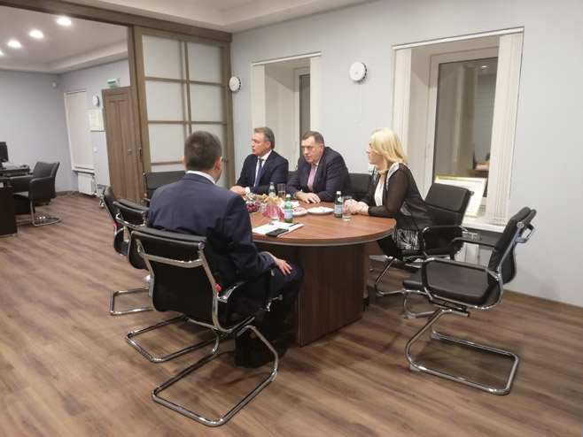 Додик и Цвијановићева разговарали су са Душком Перовићем, шеф Представништва Републике Српске у Москви, о раду канцеларије Представништва у Санкт Петербургу.