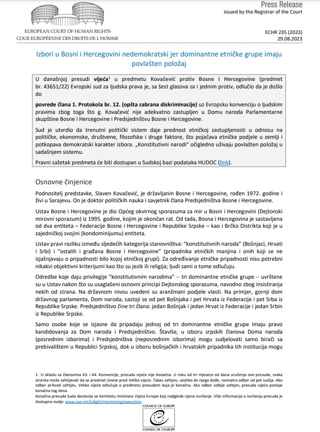 U presudi se, između ostalog, navodi da je sa šest glasova za i jednim protiv, odlučeno da je došlo do povrede člana 1. Protokola br. 12. (opšta zabrana diskriminacije) uz Evropsku konvenciju o ljudskim pravima zbog toga što Kovačević nije adekvatno zastupljen u Domu naroda Parlamentarne skupštine Bosne i Hercegovine i Predsjedništvu Bosne i Hercegovine.