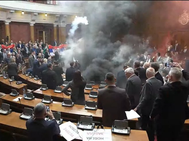 U Skupštini Srbije počela je prva sjednica redovnog proljećnog zasjedanja. Nakon usvajanja dnevnog reda, opozicioni poslanici su izazvali tuču i palili baklje. Sala skupštine ispunjena je dimom. Predsjednica Skupštine Ana Brnabić rekla je da je poslanica Jasmina Obradović na koju je bačena šok bomba doživjela moždani udar i bori se za život.