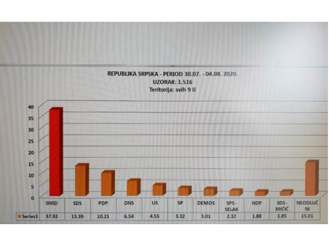 Po ovom istraživanju rađenom na prostoru cijele Republike Srpske, tačnije u svih devet izbornih jedinica, SNSD ima 37,92 odsto podrške, dok su na drugom i trećem mjestu SDS sa 13,39 i PDP sa 10,21 odsto.
