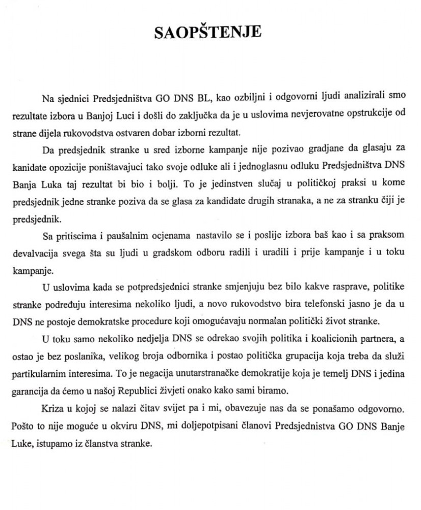 - У условима када се потпредсједници странке смјењују без било какве расправе, политике странке подређују интересима неколико људи, а ново руководство бира телефонски, јасно је да у ДНС-у не постоје демократске процедуре које омогућавају нормалан политички живот странке - истиче се у саопштењу.