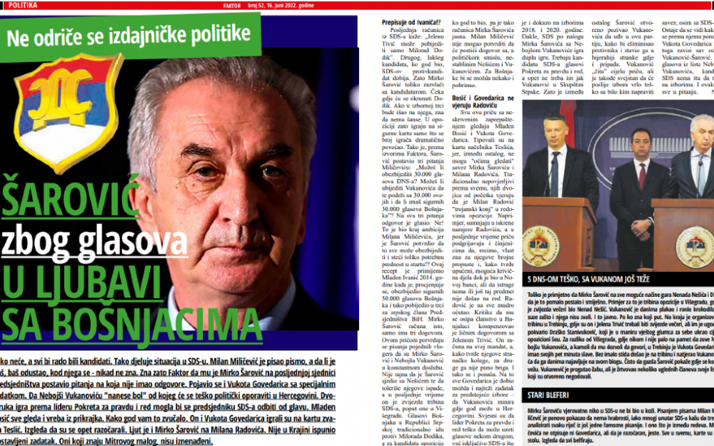 Niko neće, a svi bi rado bili kandidati. Tako djeluje situacija u SDS-u. Milan Miličević je pisao pismo, a da li je baš, baš odustao, kod njega se – nikad ne zna. Zna zato Faktor da mu je Mirko Šarović na posljednjoj sjednici Predsjedništva postavio pitanja na koja nije imao odgovore. Pojavio se i Vukota Govedarica sa specijalnim zadatkom. Da Nebojši Vukanoviću „nanese bol“ od kojeg će se teško politički oporaviti u Hercegovini. Dvostruka igra prema lideru Pokreta za pravdu i red mogla bi se predsjedniku SDS-a odbiti od glavu. Mladen Bosić sve gleda i vreba iz prikrajka. Kako god da vam to zvučalo. On i Vukota Govedarica igrali su na kartu zvanu Teslić. Izgleda da su se opet razočarali. Ljut je i Mirko Šarović na Milana Radovića. Nije u Krajini ispunio postavljeni zadatak. Oni koji znaju Mitrovog malog, nisu iznenađeni.