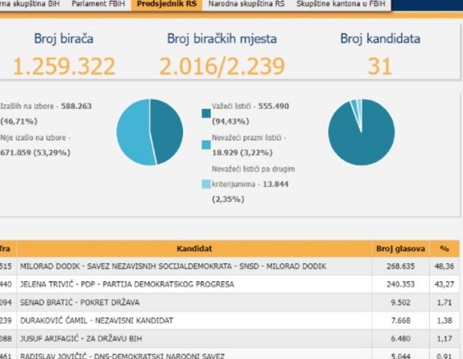Централна изборна комисија објавила је нове прелиминарне резултате за избор предсједника Републике Српске.