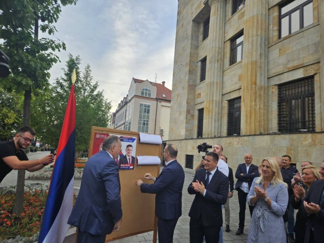 Плакат су испред Палате Републике залијепили предсједник СНСД-а Милорад Додик и кандидат ове странке за градоначелника Бањалуке Никола Шобот.