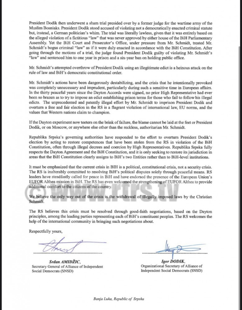 Потписници писма су организациони секретар СНСД-а Игор Додик и генерални секретар СНСД-а, те министар финансија и трезора БиХ Срђан Амиџић.