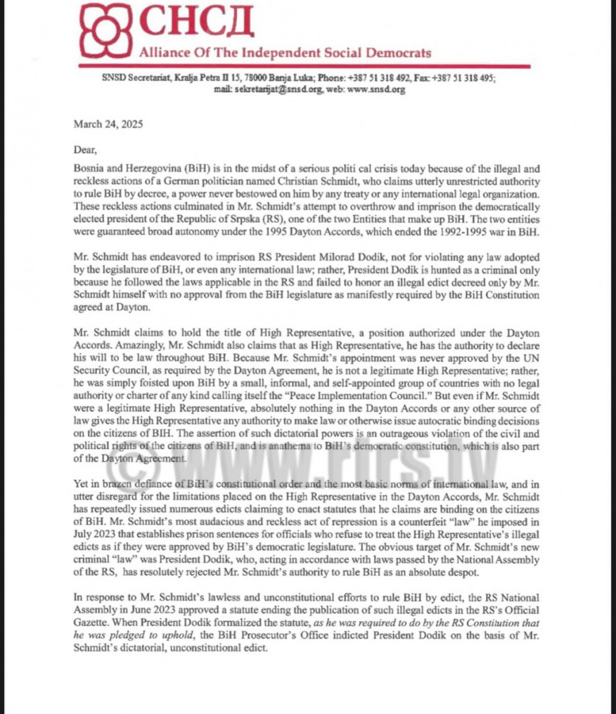 – Босна и Херцеговина данас се налази усред озбиљне политичке кризе због незаконитих и неопрезних поступака њемачког политичара Кристијана Шмита, који тврди да има апсолутну власт да управља БиХ својим одлукама, узимајући овласти које му никада нису биле додијељене ниједним уговором нити било којом међународном правном организацијом. Ови неопрезни поступци кулминирали су покушајем господина Шмита да смијени и затвори демократски изабраног предсједника Републике Српске, једног од два ентитета који чине Босну и Херцеговину. Ова два ентитета имала су широку аутономију загарантовану Дејтонским споразумом из 1995. године, који је окончао рат у БиХ од 1992. до 1995. године. Господин Шмит настоји ухапсити предсједника Српске Милорада Додика, не због кршења било којег закона који је донијело законодавно тијело у БиХ, нити због кршења било којег међународног закона; већ је предсједник Додик ловљен као криминалац искључиво зато што је слиједио законе који важе у Републици Српској и није поштовао незаконити декрет који је издао само господин Шмит, без одобрења законодавног тијела БиХ, што је јасно захтијевано Дејтонским уставом БиХ - пише СНСД.