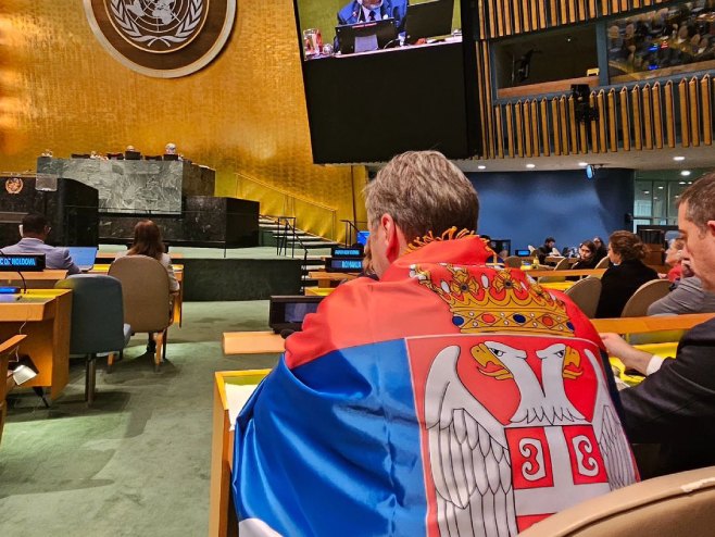 Predsjednik Srbije Aleksandar Vučić ogrnuo se srpskom zastavom tokom sjednice Generalne skupštine Ujedinjenih nacija.