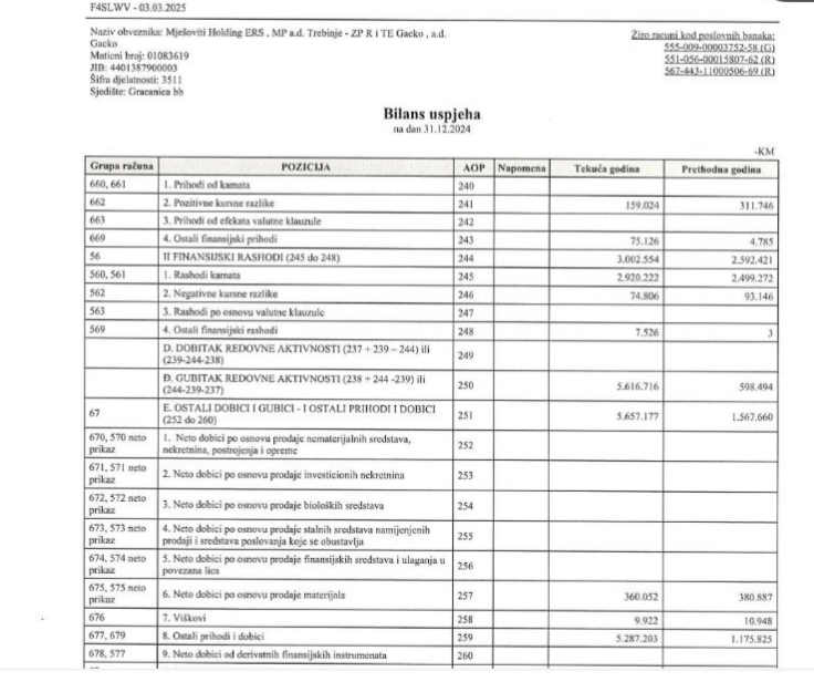 Prema objavljenom završnom finansijskom izvještaju RiTE Gacko za 2024. godinu, kompanija je prikazala neto dobit u iznosu od 1,41 miliona KM. Međutim, detaljnijom analizom izvještaja dolazimo do zaključka da su poslovni prihodi bili manji od poslovnih rashoda, što je rezultiralo poslovnim gubitkom od 2,8 miliona KM. Dodatno, bilježi se enormni finansijski rashodi - rashodi po osnovu kamata po kreditima u korištenju iznose oko 3 miliona KM tako da gubitak redovne poslovne aktivnosti iznosi 5,62 miliona KM. Ključni faktor koji je uticao na konačan rezultat bio je vanredni prihod u iznosu od 5,66 miliona KM, zahvaljujući kojem je u završnom bilansu iskazana dobit. Pored ovoga knjiženi su i efekti povećanja odloženih poreskih obaveza što je u ukupnom rezultiralo da ostvarena neto dobit iznosi 1,41 miliona KM.