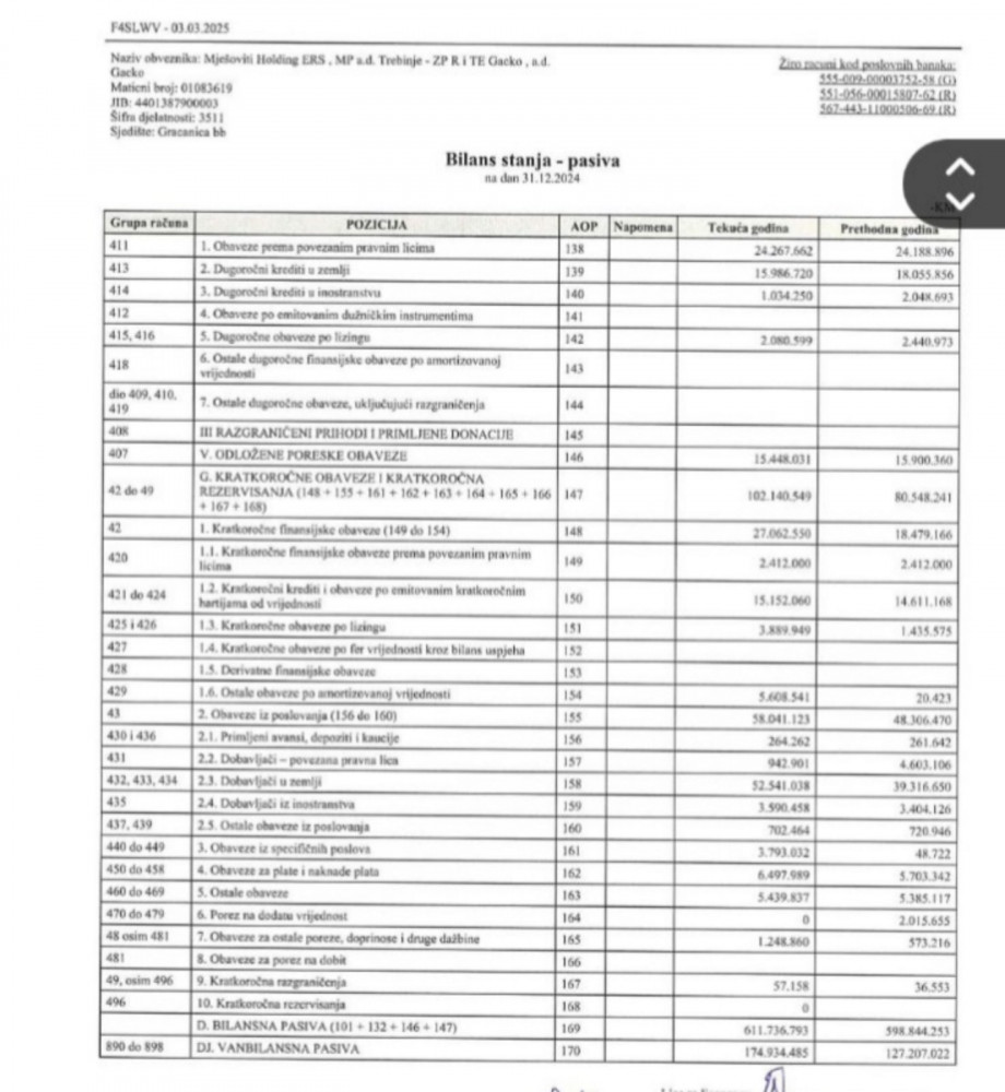 Jedan od ključnih problema koje izvještaj otkriva jeste ozbiljna nelikvidnost kompanije. Potraživanja od kupaca iznose svega 800 hiljada KM, dok su obaveze prema dobavljačima čak 57 miliona KM. Ovakav nesrazmjer jasno ukazuje da RiTE Gacko nema dovoljno sredstava za redovno izmirenje svojih obaveza, što postavlja pitanje kako će se finansirati u budućem periodu.