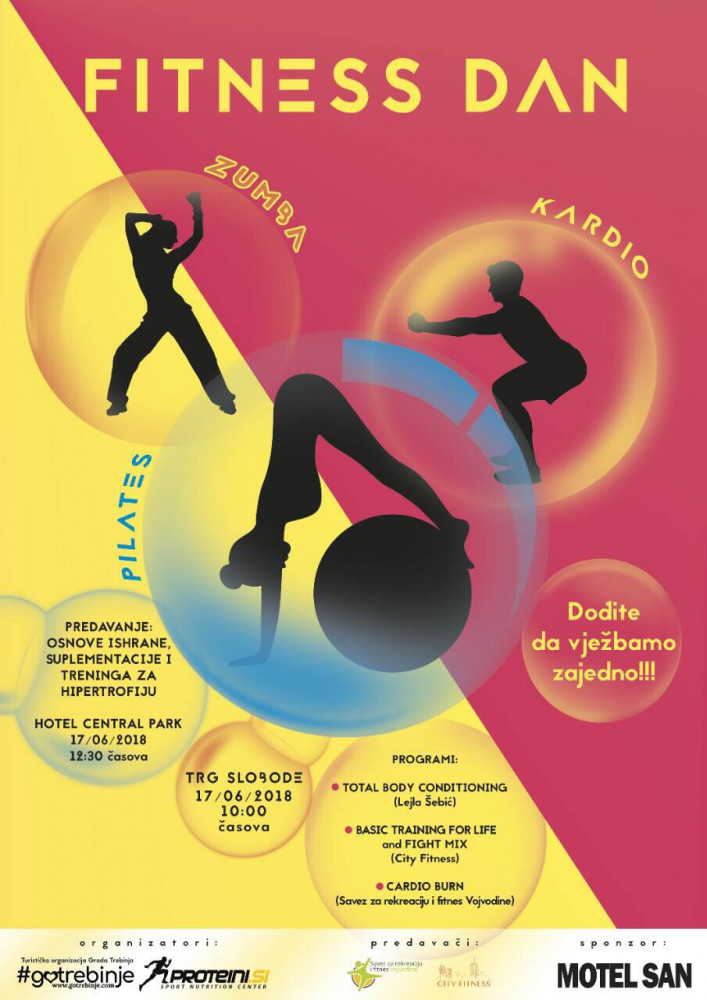 Спортско-туристичко дешавање "Фитнес дан" биће одржано у недјељу, 17.06.2018. године на Тргу слободе са почетком у 10 часова, када ће бити приређено вјежбање на отвореном и стручно предавање, а све то уз професионалне иснструкторе фитнеса и предаваче признате стручњаке из ове области из "Савеза за рекреацију и фитнес Војводине" и "City fitness-a".