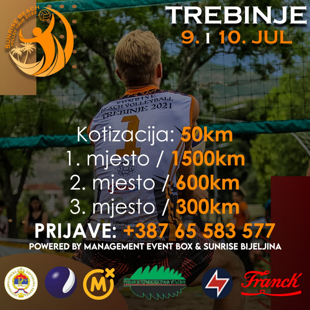 У Требињу, на Бреговачком базену, 9. и 10. јула биће одржан сада већ најпопуларнији турнир на пијеску у Републици Српској, " "Sunrise beach volley tour 2022".