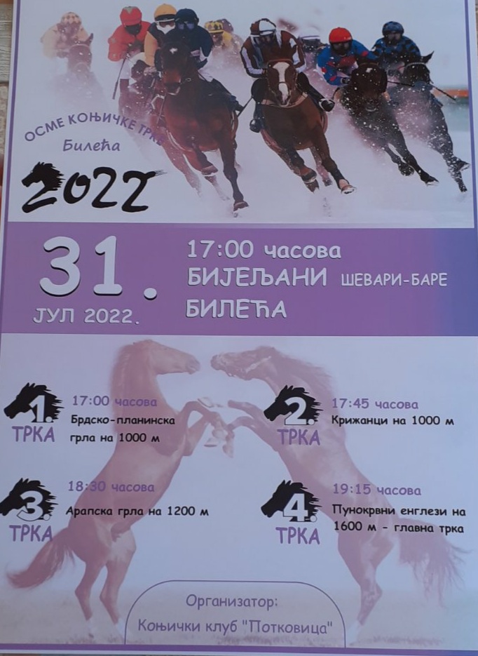 Osme konjičke trke održaće se u Bileći ,31.jula 2022.godine sa početkom od 17 časova. Organizator trka konjički klub ''Potkovica''.