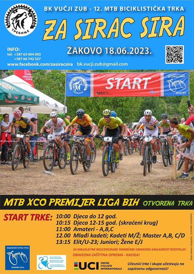 Biciklistički klub “Vučji zub” Trebinje dana 18.06.2023. (nedjelja) organizuje XII brdsku biciklističku trku “Za sirac sira” u trebinjskom selu Žakovo. Trka će se bodovati za Premijer ligu BiH, a nastupiće i takmičari iz inostranstva.