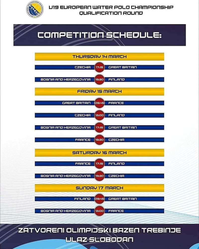 Kvalifikacije za Evropsko vaterpolo prvenstvo U19 održaće se u Trebinju od 14 do 17. marta i to je prvi put u istoriji da će Bosna i Hercegovina biti domaćin ovog prvenstva. Trebinje će, uz domaćine BiH reprezentaciju ugostiti reprezentaciju Francuske, Češke , Velike Britanije i Finske koje će pokušati da se plasiraju na Evropsko prvenstvo Ovo će ujedno biti i prvi nastup juniorske vaterpolo selekcije Bosne i Hercegovine, a na spisku selektora Stevana Nonkovića našao se igrač trebinjskog " Leotara " Gojko Janković, pored njega u ulozi pomoćnoga trenera je trener VK Leotar Nikola Lješković. Kvalifikacioni turnir se održava na zatvorenom olimpijskom bazenu u Trebinju ,a ulaz je slobodan.