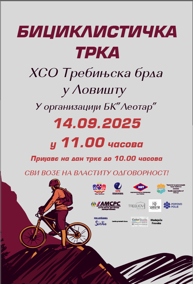 У недјељу, 14. септембра 2025. године, у Ловишту ће бити одржана бициклистичка трка „ХСО Требињска брда“, у организацији Бициклистичког клуба „Леотар“.