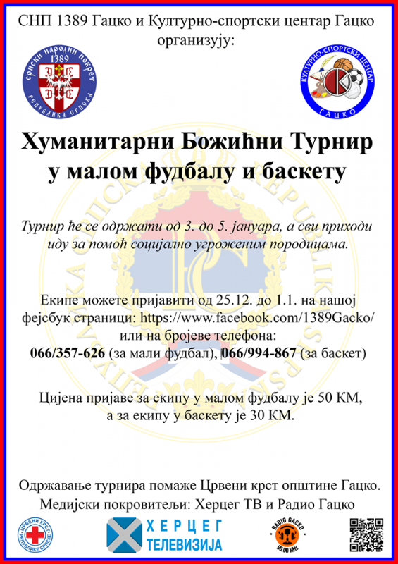 SNP 1389 Gacko i „Kulturno-sportski centar“ Gacko, od 3. do 5. januara, organizuju peti po redu Humanitarni Božićni turnir u malom fudbalu i basketu.