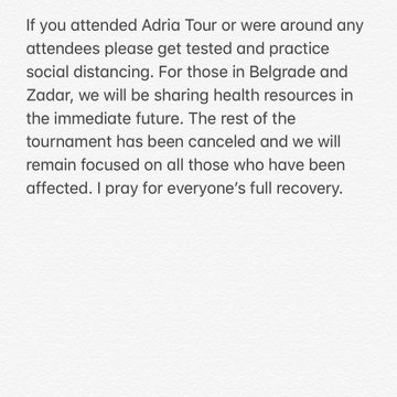 - Ako ste bili na Adrija turu, ili ste bili u blizini nekog od učesnika, molim vas, testirajte se i poštujte socijalnu distancu. Za one u Beogradu i Zadru, sa njima ćemo podijeliti zdravstvene resurse u bliskoj budućnosti. Ostatak Tura je otkazan i ostaćemo fokusirani na one koji su pogođeni. Moliću se za pun oporavak svih - dodao je Đoković.