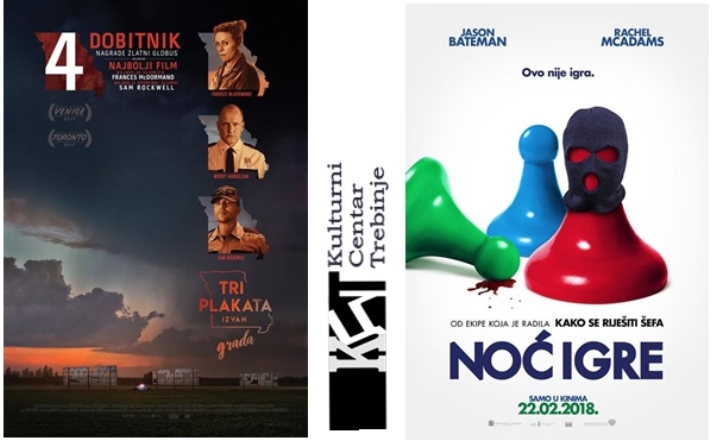 Требињска публика ће у наредном периоду, до 27. фебруара, имати прилику да ужива у два нова филмска остварења. Ријеч је о црној комедији "Три плаката изван града" чија пројекција почиње сваки дан од 18 часова и комедији "Ноћ игре", која ће се приказивати од 20 часова.