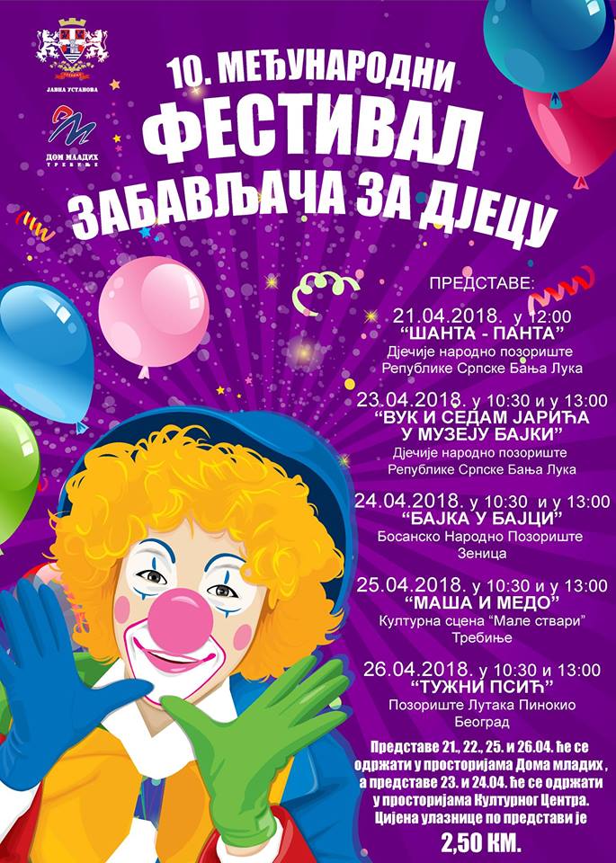 У организацији ЈУ "Дом младих", а под покровитељством Града Требиња, од 21. до 26. априла одржаће се 10. Међународни фестивал забављача за дјецу.
