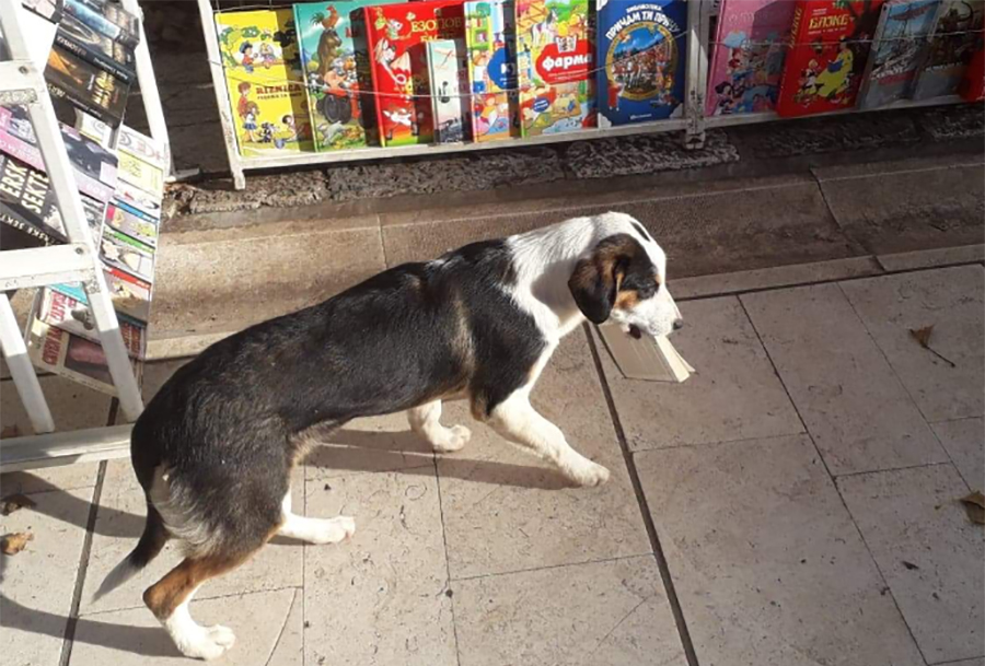 Ulični prodavac knjiga u centru Trebinja zamalo je ostao bez jedne knjige, nakon što je pas prišao štandu i uzeo knjigu sa donje police.