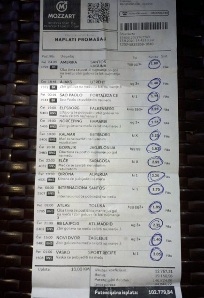 Ovaj sportski i kladilački velemajstor iz Trebinja je odigrao pobjednički tiket na uplatno-isplatnom mjestu Trebinje 1, koje se nalazi na adresi Beogradska bb, pogodio kvotu 12.767,31 što na ulog od 10 KM iznosi fenomenalnih 146.824,06 KM.