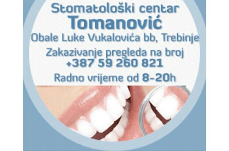 Stomatološki centar "Tomanović" je moderna, savremeno opremljena ordinacija koja svim svojim pacijentima pruža najkvalitetnije usluge u najprijatnijim uslovima. Ordinacija se nalazi u Trebinju, obala Luke Vukalovića bb, a osnivač i vlasnik je dr Milan Tomanović.