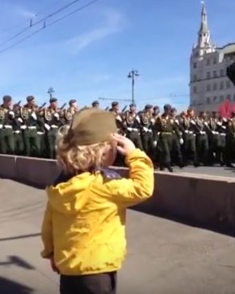 Малишан Иља Казан одаје почаст војницима који марширају на проби Параде победе у Москви. На радост дечака, многи војници одлучили су да му узврате поздрав.