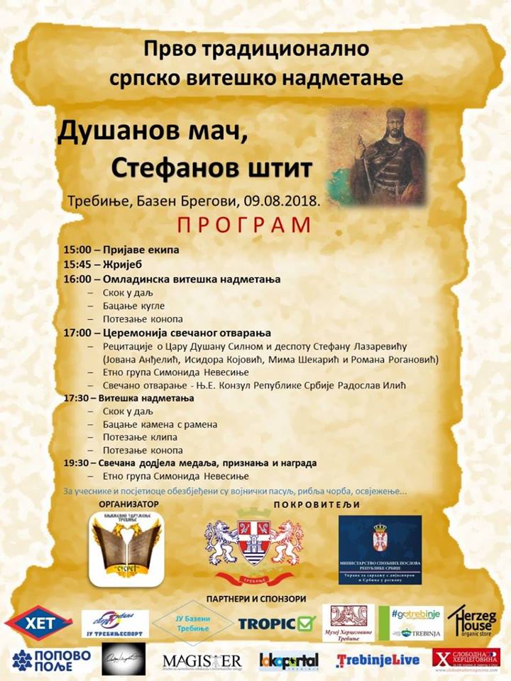 U okviru projekta „Povratak tradiciji – ćirilična kultura i tradicionalne igre“ u četvrtak, 9. avgusta, sa početkom u 16 časova na bazenu u Bregovima, biće organizovana manifestacija tradicionalnih srpskih viteških nadmetanja „Dušanov mač, Stefanov štit“.