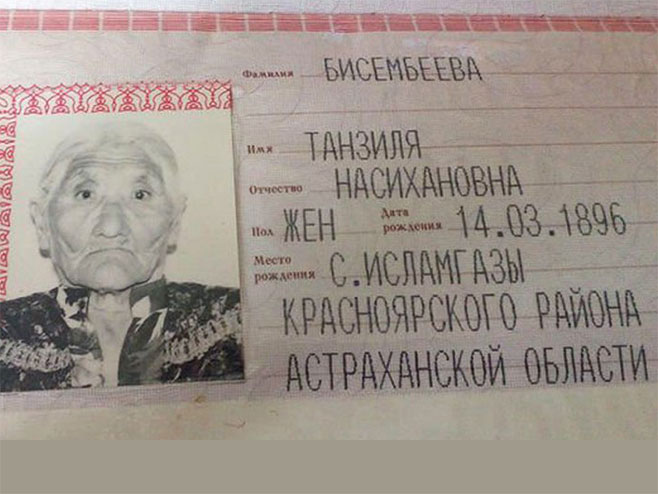 Танзила Бисембејева из Астраханске области, која је била најстарији држављанин Русије, преминула је у 123. години, изјавио је локални гувернер Нургали Бајтемиров.