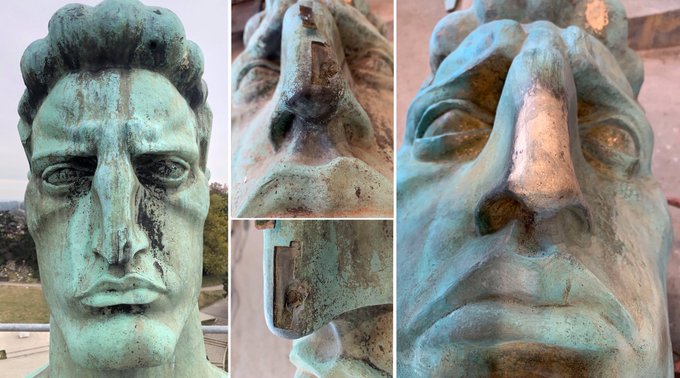 - Закрпа на носу која је вјероватно посљедица грешке у оригиналном калупу је скинута, а реконструкција оштећеног дијела урађена је бронзом идентичног састава. Разлика у боји између свјеже бронзе и патине је нормална појава и до краја радова ће бити непримјетна“, саопштено је из Завода за заштиту споменика културе града Београда на званичном Твитер налогу "Победника".