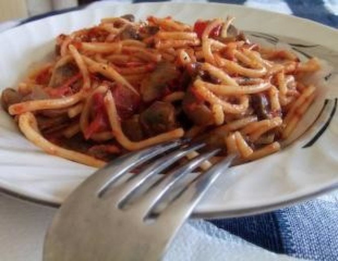 Оперите добро шампињоне и исјецкајте их на танке листиће. У шерпу ставите уље да покрије дно и додајте шампињоне и со и поклопите. Оставите да се динста док шампињони не пусте воду. У међувремену скувајте шпагете. Када су шампињони пустили воду налијте парадајз и оставите да прокључа. Када прокључа, смањите и додајте кашику меда, вегету, љуту паприку, бибер и ајвар. Оставите да крчка отклопљено око три минута. Пред крај кувања у сос од шампињона и парадајза додати оригано и босиљак, а затим и скуване шпагете.